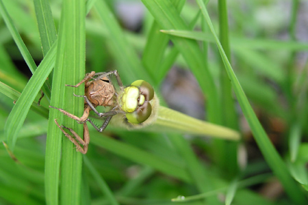 池のふちの草むらをたんねんにさがしていると、羽化したばかりのトンボもみつかりました。ヤゴのぬけがらもいくつかみつかりましたので、トンボたちの羽化も始まっているようです。発生時期は、例年よりやや遅めのようです。
