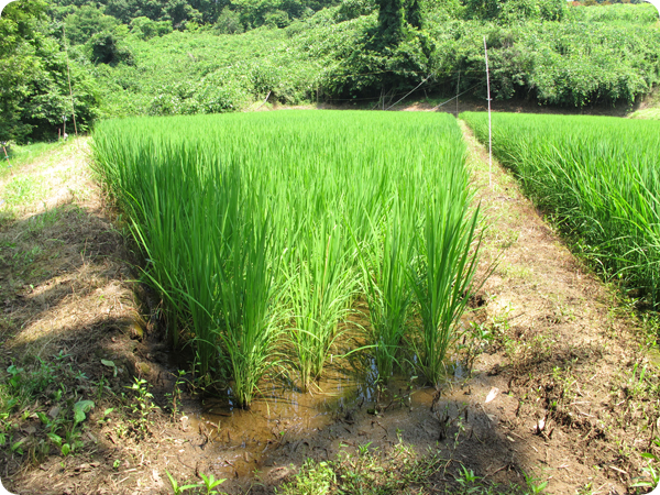 夏のえほんの丘 くりのみ坂の雑木林を歩いていると、 ハグロトンボがあしもとからひらひらと飛び立ちます。 ザーっと、シノの葉を鳴らすのはヒグラシです。 昼間は、わりと低いところで休んでいるようです。 えほんの丘農場イベント『田植え』のときに植えたイネも、元気に成長しています。 もう、大人の腰くらいの高さになっています。 ウグイス谷を歩いていたら、トウキョウダルマガエルのなく声が聞こえたので、 見てみるとタガメにしがみつかれて、吸い付かれていました。