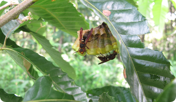 夏になり、アシナガバチのなかまの巣が大きくなりはじめているようです。