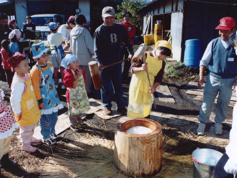 春のイベント田植えのときにイネを植え、秋のイベントいねかりいねかりで刈り取りをして、天日干しにして収穫したもち米。せいろでふかして、きねとうすを使ってもちをつきます。