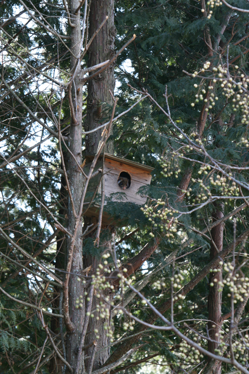 巣箱のムササビ このところ毎日、ムササビが巣箱から顔を出している様子が、美術館のティールームから良く見えます。 ティールームのデッキに出て、左手に見えるヒノキ林のなかに取り付けてある巣箱です。 毎日草原をながめながら、ボーッとしているように見えます。 ご来館の際には、ぜひムササビの様子を観察してみてください。 (この巣箱は、以前開催した巣箱作りのイベントの際に、友の会会員のかたが作ってくださったものです。) 巣箱の右手前に見える、黄緑色の実は、センダンの実です。