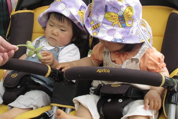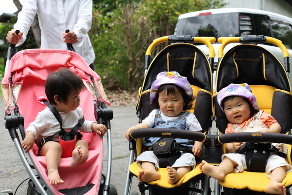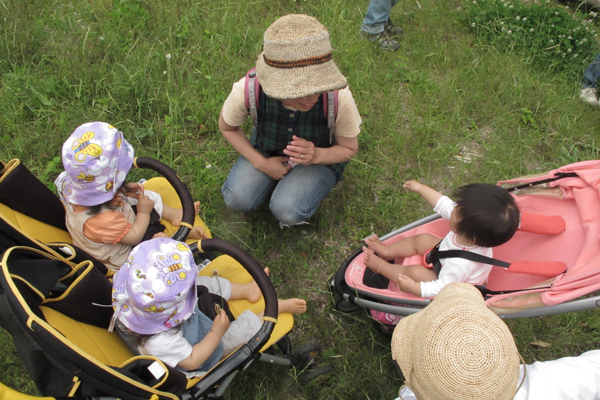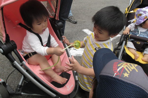 ベビーカーに乗ったり、だっこしてもらってくさっぱら広場へ向かって出発。