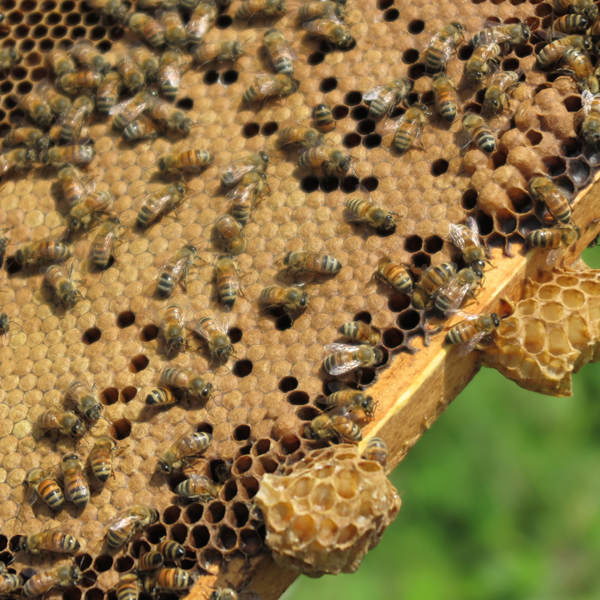 巣板のはじっこのほうには、女王バチを育てるためのへやがつくりかけになっています。