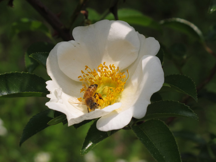 下の画像は、クローバーの花でミツを吸うミツバチです。